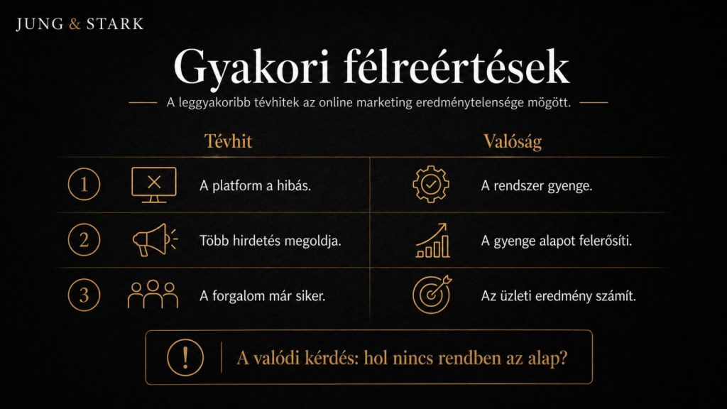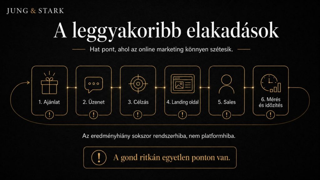 Ebben a helyzetben a „nem működik az online marketing” valójában nem egyetlen hibát jelent, hanem több rosszul kapcsolódó elemet.
